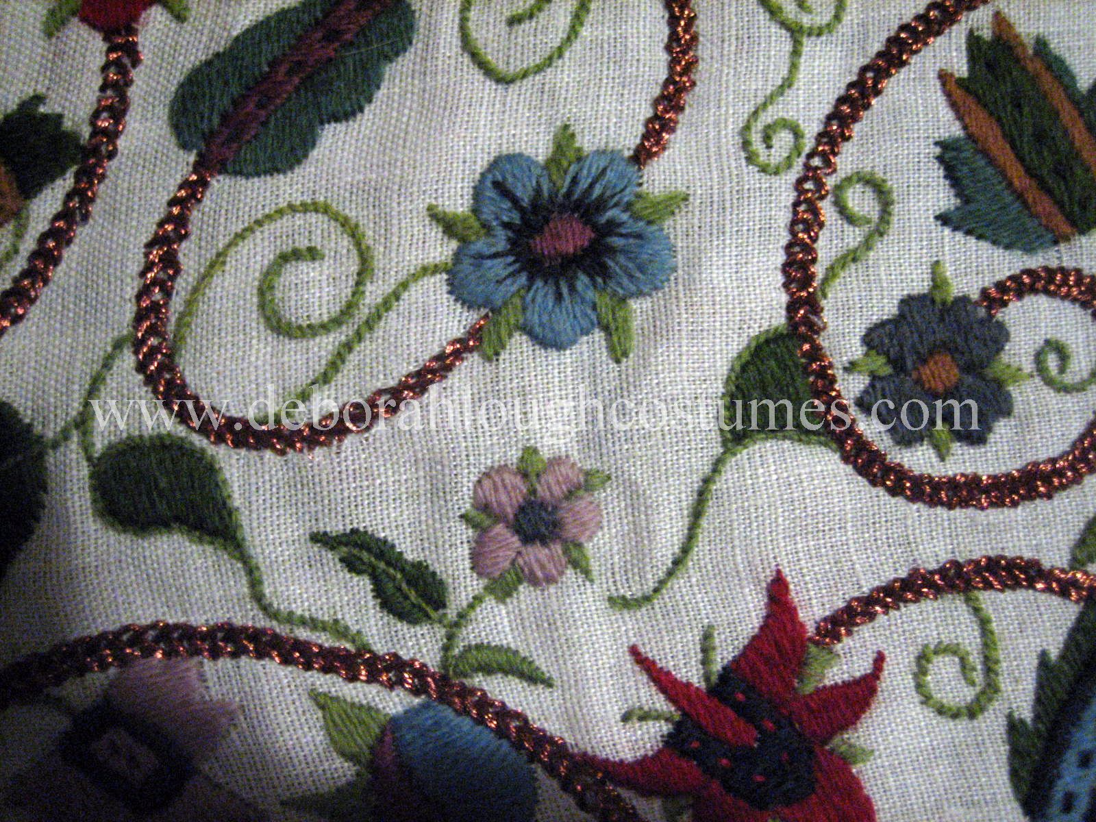 | This is a 17th century woman's coif. Or to be precise, half of a 17th century coif. The pattern comes from an extant piece in the Victoria and Albert Museum, London. The original is embroidered in polychrome silks, with gold metallic threads. This one is embroidered in naturally dyed pure wool crewel threads, and copper coloured metallic threads (the latter containing 2% silver). The ground of the original, and this version are both pure linen. I should probably add that the embroidery is all done by hand. More pictures below. Apart from the one at the top, which is full size already, these should all be thumbnails, so you can get a closer view. Let me know if they don't work! |