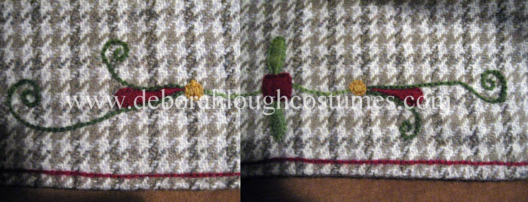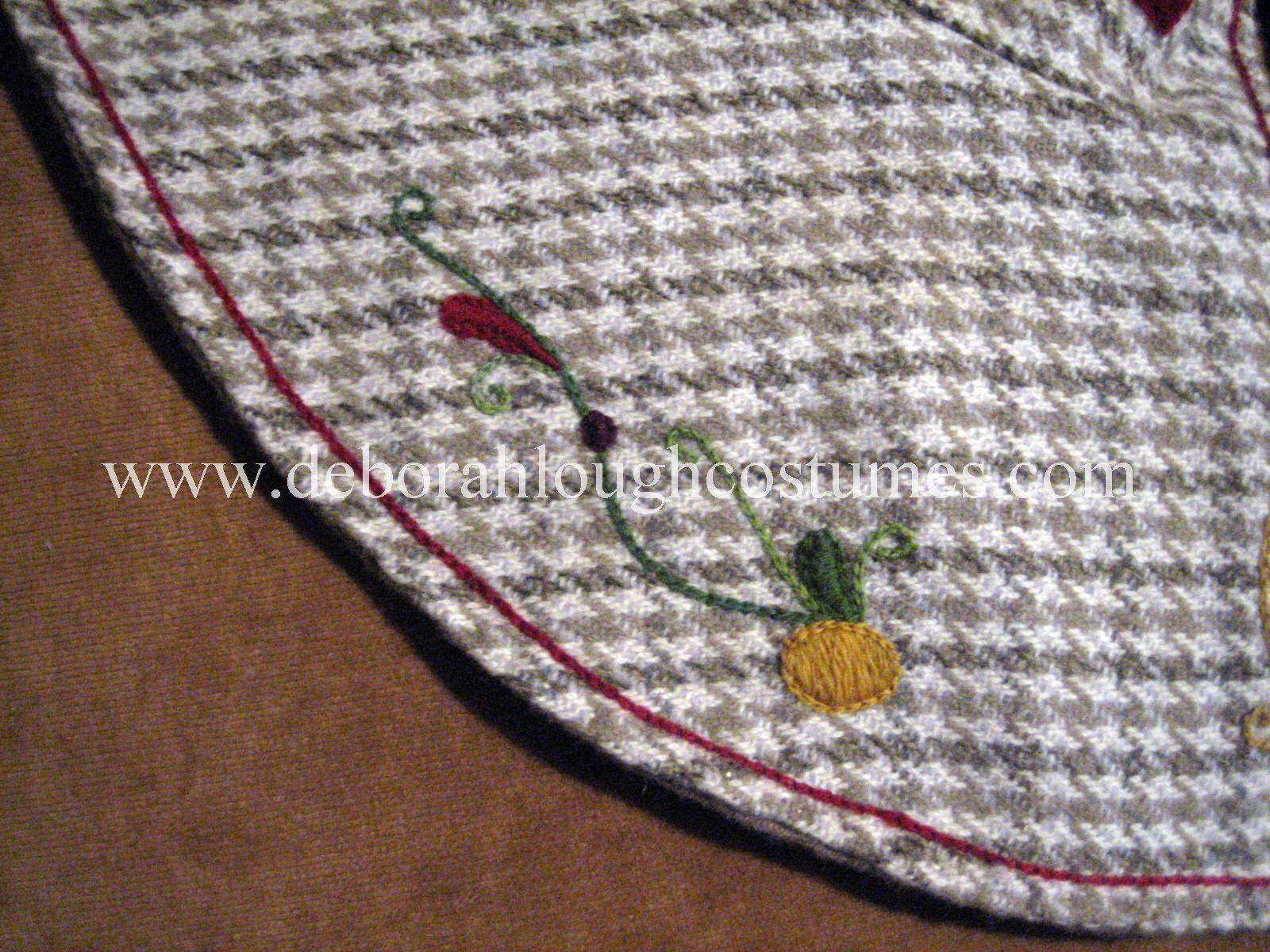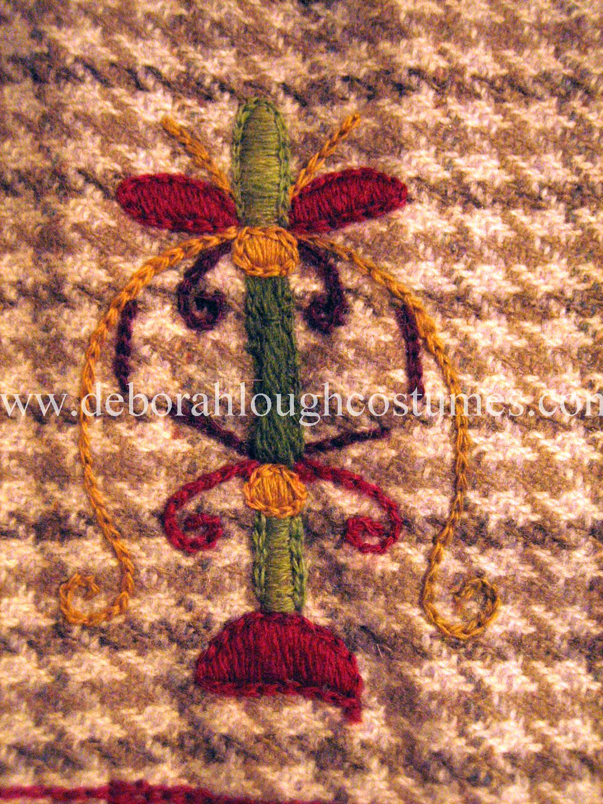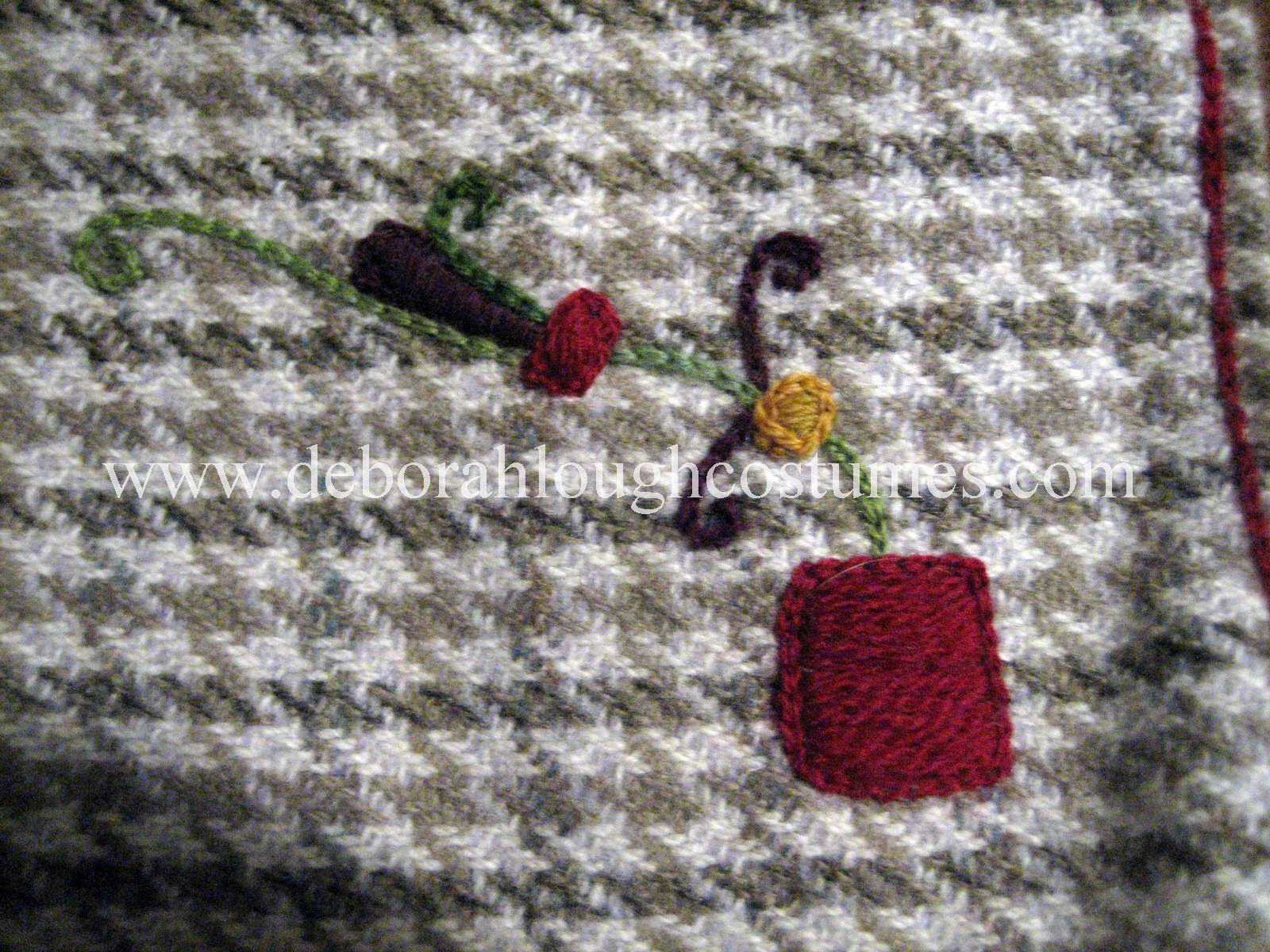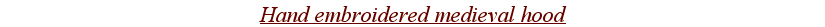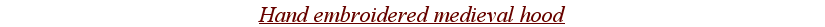 | A hood made in a dogtooth check wool, and lined with plain wool. The hood is embellished with hand embroidered motifs, all of which are taken from the edging sections at the top and bottom of the Bayeux Tapestry (which should of course be known as the Bayeux embroidery). The hood is completed by chain stitch, worked at all of the edges. The embroidery is carried out in very fine naturally dyed welsh wool. Two of these hoods exist - the only difference being that I used slightly different colours for the embroidery. All pictures should be thumbnails, to allow you to see the work in more detail. |