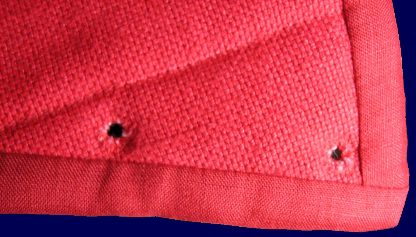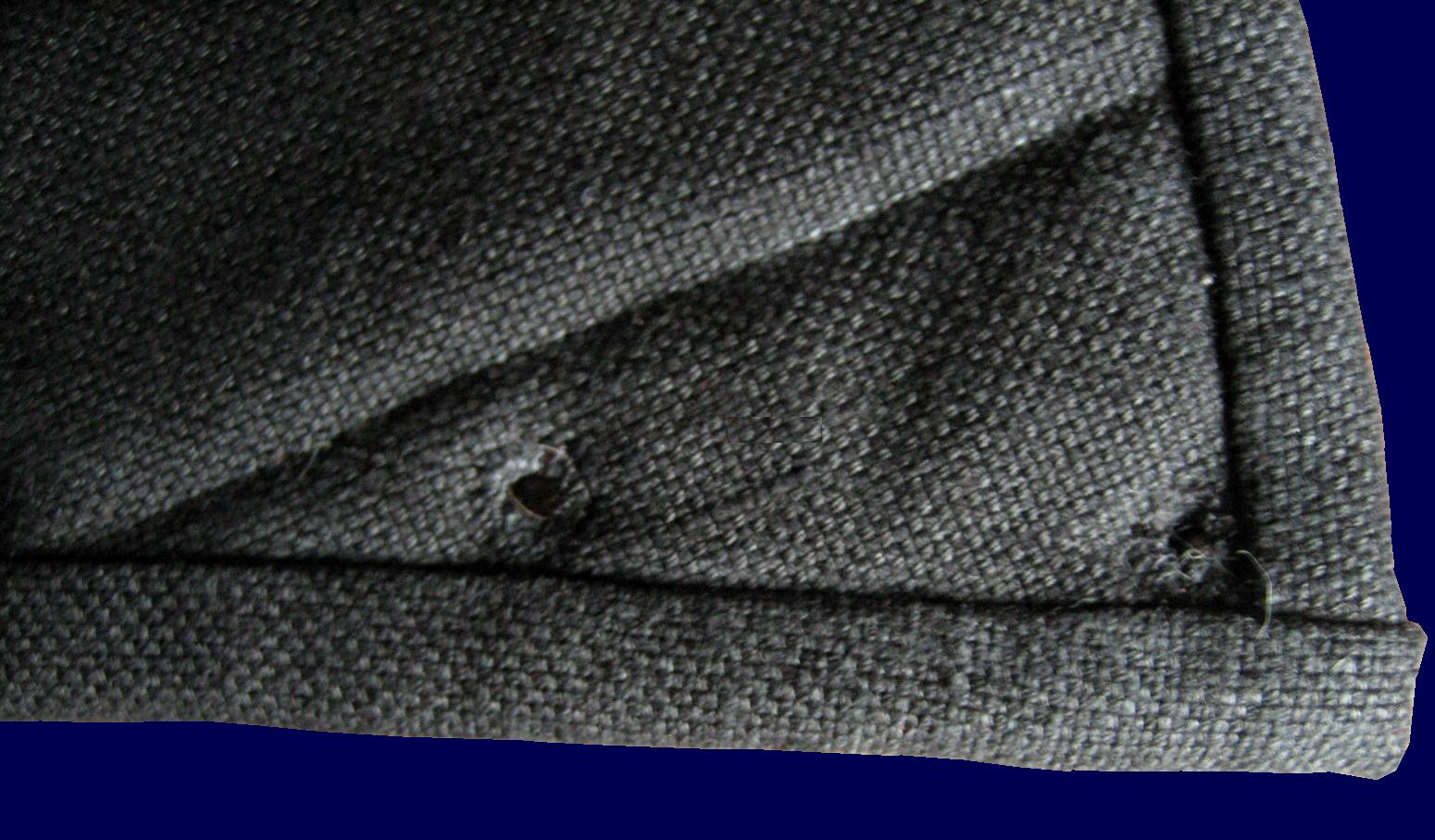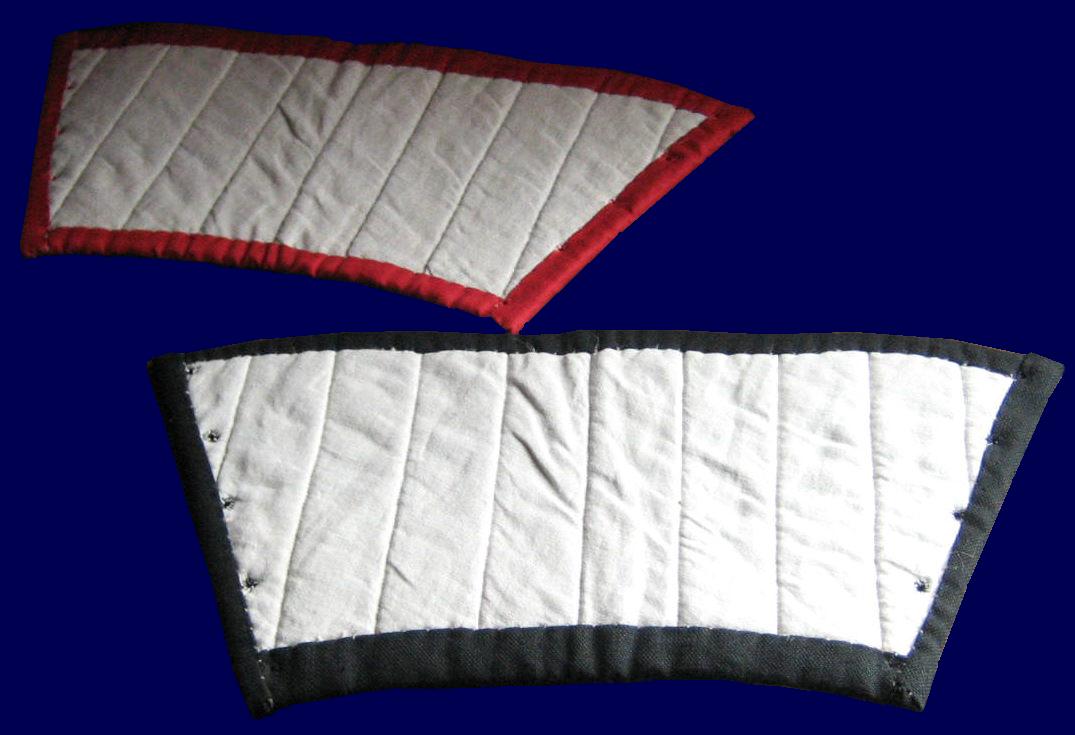 | A pair of gamboised cuisses in red and black. Gamboised cuisses are early medieval padded leg (or thigh) coverings. These are made with a heavy weight linen outer (the same linen, dyed to shade), lined in a lighter natural linen. The cuisses are slightly curved, to allow for the shape of the leg, and fasten with points at the back or inside leg (by preference). The quilting is done by machine, and the edging and eyelets are done by hand (the eyelets sewn over internal metal rings, as usual). |