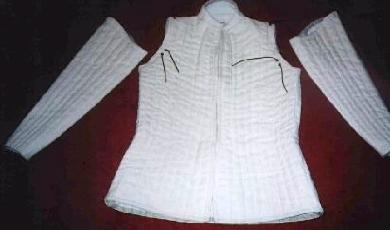 | A late medieval padded jack, made in a heavy weight white linen. This jack is made with woollen layered padding (i.e. woollen fabric between the linen), and it is lined with off white shirt weight linen. The sleeves are made as separate pieces, and attach to the body with points, at the shoulder. These point holes are hand sewn, and re-enforced with internal metal rings. The front fastens with hand made hooks and eyes, over a protective port piece. |