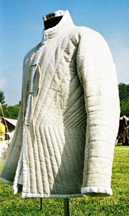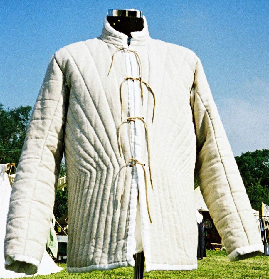| A late medieval padded jack, made in heavy weight linen, and lined in linen. The padding is layered organic cotton [aka batting], meaning that the jack is fully washable (with care). The quilting pattern seen on the body of the ack is based on the Lubeck jack (which is dated to approx. 1450 - 1475). The lightly curved sleeves are horizontally quilted. The front fastens with points, over an internal protective port piece. The point holes are hand sewn, over hidden metal rings. |