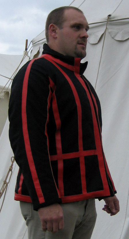 | An arming doublet made in black linen, with red leather re-enforcing strips. The centre front fastens with hand made hooks and eyes, and the doublet is lined with off white linen. The arming doublet is gusseted at the underarms, and is lightly padded. |